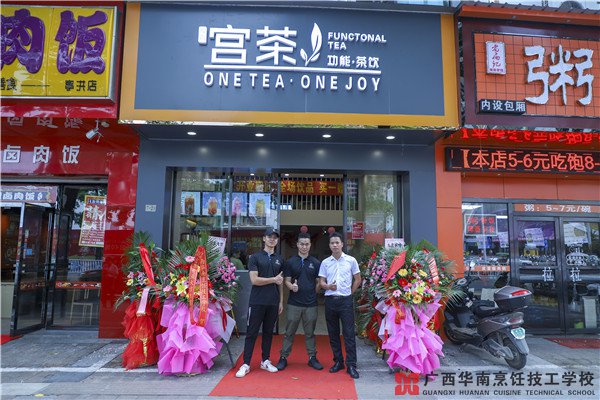 在广西华南烹饪技工学校学习的过程中,他们不仅掌握了传统饮品的的制作,自己还研究了许多网红产品,如今两人的产品逐渐被更多人熟知认可,两个人也有了一些积累。今年夏天,两个人的第一家奶茶店“宫茶”正式开门营业。