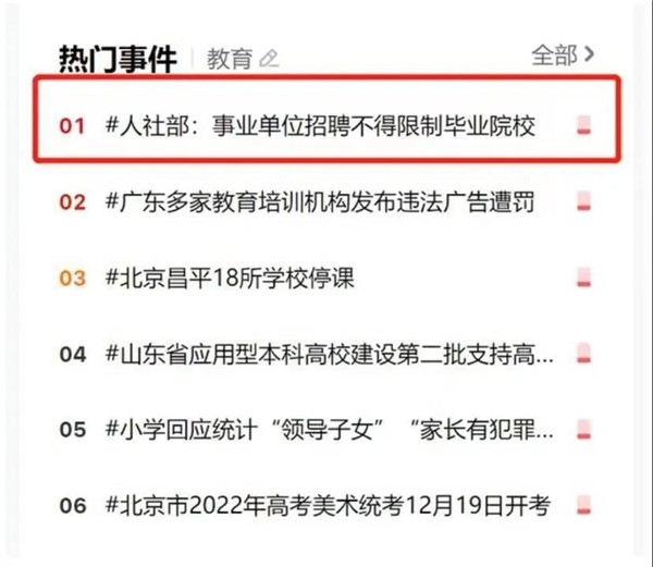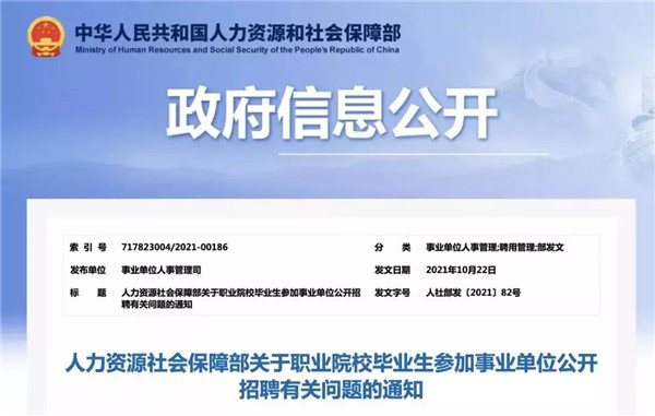 近日,人力资源社会保障部印发《关于职业院校毕业生参加事业单位公开招聘有关问题的通知》,要求事业单位公开招聘要树立正确的选人用人理念,破除唯名校、唯学历的用人导向,切实维护、保障职业院校(含技工院校)毕业生参加事业单位公开招聘的合法权益和平等竞争机会。
