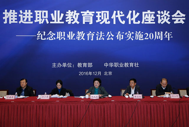 推进职业教育现代化座谈会12月2日在京召开。中共中央政治局常委、国务院总理李克强作出重要批示。批示指出:加快发展现代职业教育,对于发挥我国人力和人才资源巨大优势、提升实体经济综合竞争力具有重要意义。在各方面共同努力下,近年来职业教育改革发展取得了显著成就,应予充分肯定。“十三五”时期,希望围绕贯彻党中央、国务院重大战略部署,落实新发展理念,切实把职业教育摆在更加突出的位置,加快构建现代职业教育体系。坚持面向市场、服务发展、促进就业的办学方向,进一步深化改革创新,强化产教融合、校企合作,积极鼓励和支持社会力量参与,努力建成一批高水平的职业学校和骨干专业,加快培育大批具有专业技能与工匠精神的高素质劳动者和人才,深度融入大众创业、万众创新和“中国制造2025”的实践之中,促进新动能发展和产业升级,带动扩大就业和脱贫攻坚,为推动经济保持中高速增长、迈向中高端水平作出新贡献。中共中央政治局委员、国务院副总理刘延东出席会议并讲话。她强调,要深入贯彻党中央、国务院决策部署,认真落实李克强总理重要批示,加快推进职业教育现代化,使职业教育在决胜全面小康进程中发挥更加突出的作用。
