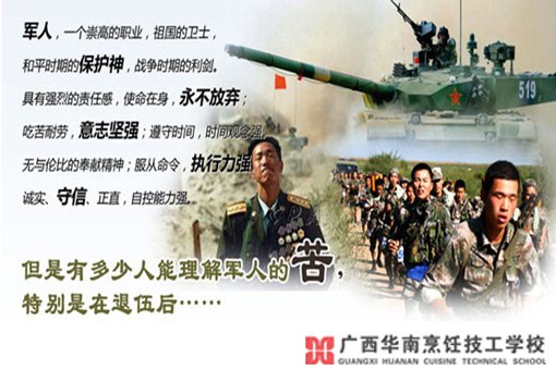 阔别国家军队,我们希望越来越多的退伍军人能加入广西华南烹饪技工学校,争做烹饪“特种兵”,退伍不褪色!