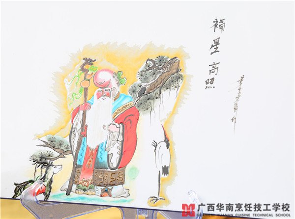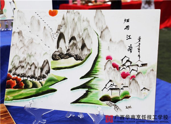 在广西华南烹饪技工学校,同学们除了学习烹炒煎炸这样的烹饪技能,果酱盘饰也是大家学习的内容之一。同学们制作的果酱盘饰,有意的花鸟鱼虾,或者是优美飘逸的文人书法、古诗,无论哪一个都显得栩栩如生,亮点甚是吸睛。