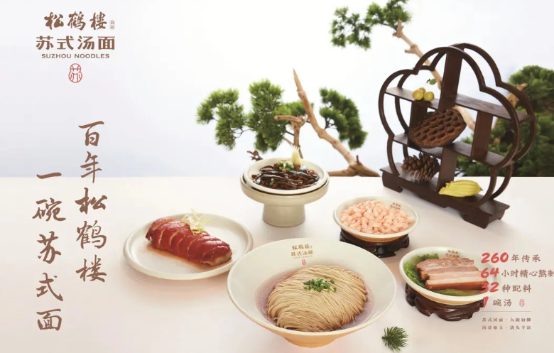 江南美食众多,如果只选择一样美食代表苏州,那必定是苏式汤面。松鹤楼正是以面业起家,以焖肉面等苏式面点而闻名。聚焦「一碗苏式面」,松鹤楼以 260 多年传承、64 小时精心熬制以及 32 种配料出一碗汤的传统配方,不仅有力抢占苏式面赛道的广阔市场,也通过一碗面的尝鲜唤醒行动,在年轻一代消费者中有效的种下品牌心智。