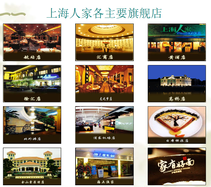 上海人家集团公司成立于1998年,旗下还另有两个特色品牌连锁餐饮,是沪上最大的母航型餐饮企业。在中国内地有25家门店;在境外,上海人家现有2家门店,分别位于日本横滨和加拿大温哥华。上海人家平均每家店的经营面积约为2000平米,现有员工近2500人。上海人家本着“上海为根”、“以人为本”的餐饮新理念,从各店的选址、装潢、菜谱、出品、服务等各方面,无一不渗透出人性化的气息,营造着家一般的氛围。