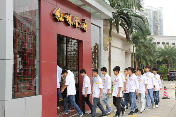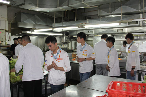 南宁红林大酒店是南宁市最高端、规模最大、配套最完善的五星级酒店之一,该酒店从广西华南烹饪学校建校之初就与之建立起校企合作关系,并在校设立定点委培基地,签订订单式就业协议,为学生提供优越的薪资待遇及广泛的发展空间。虽然酒店环境优越,但学生们还是希望亲自见识一下。沃顿酒店的行政主厨带领学生们对富丽堂皇的酒店和配备完善的后厨进行了一次仔细的观摩。广西华南烹饪学校设有酒店式模拟厨房,学生在平时学习中就可以模拟酒店后厨中的各个岗位,因此当学生们走入沃顿酒店后厨时,对这里的设施设备并不陌生,但酒店厨房的规模还是让学生们为之一惊。一想到这里很可能会是他们以后的工作场所,学生们非常兴奋,纷纷拍照留恋。
