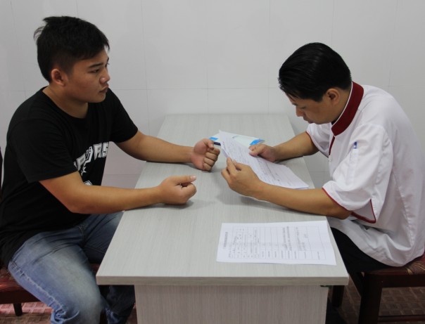 荔园山庄餐饮部郭总正在面试学生