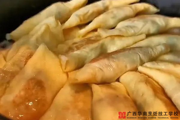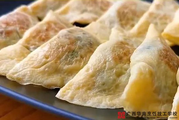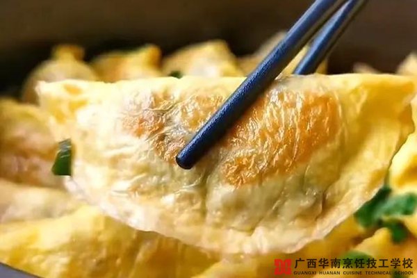 5、平底锅预热刷油倒入一勺蛋液摊成小饼,放入一勺做好的肉馅对折包上。
