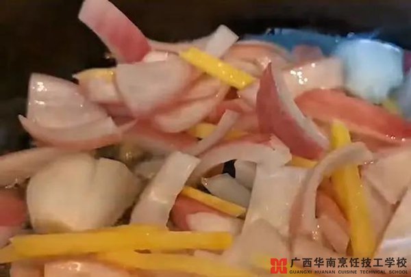 7、砂锅放入少许食用油下入姜丝,大蒜煸炒,炒出香味后下入洋葱,萝卜条,加入生抽,少许食盐。