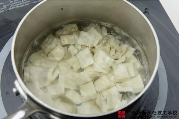 4、豆腐切小片,放入沸水中焯水,加入黄鱼片,淋酒,捞出。