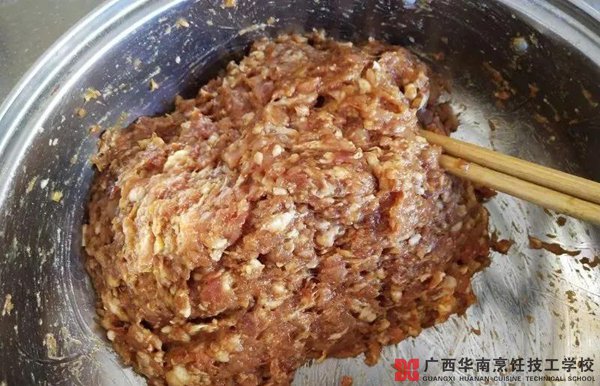 2. 鸡肉馅儿,猪肉馅儿和牛肉馅儿全部放入盆里。