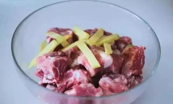 1、用水冲洗排骨,将它浸泡在清水中15分钟,然后沥干。放在碗中,加入生姜丝、料酒、盐,腌30分钟。