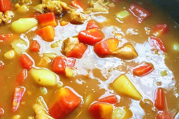 11. 鸡块熟了放入土豆和红萝卜同炖。