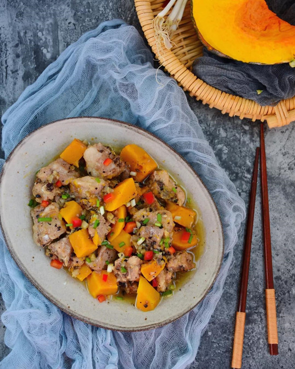食材:排骨 200g、南瓜 150g、豆豉 1小撮、蒜 3-4瓣、生抽 1汤勺、盐 1小撮、油 0.5汤勺、淀粉 1汤勺、料酒 1盖子、胡椒粉、蚝油 0.5汤勺、白糖、生姜 2片、葱、鸡精。