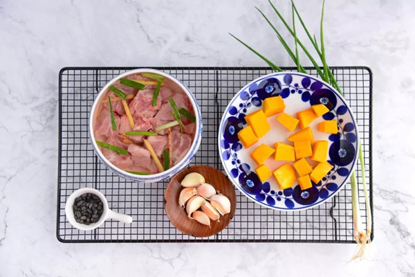 2.南瓜去皮切小块,排骨反复冲洗掉血水,放入大碗里,放姜丝、葱段、一盖子料酒,加清水浸泡半小时。