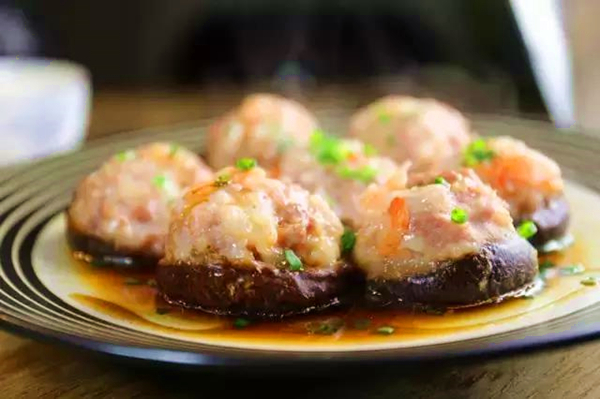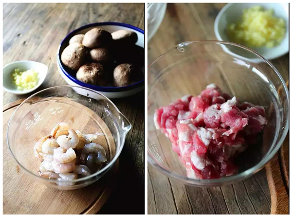 鲜虾500g、五花肉50g、香菇8朵、小葱少许、生粉1汤匙、盐1茶匙、糖1茶匙、胡椒粉1茶匙、生抽1汤匙
