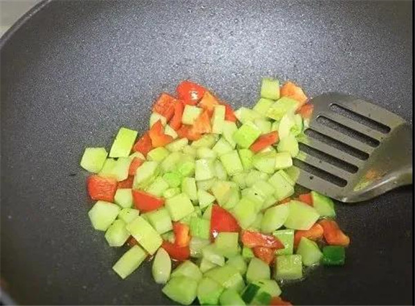 将黄瓜和红甜椒入锅翻炒一分钟