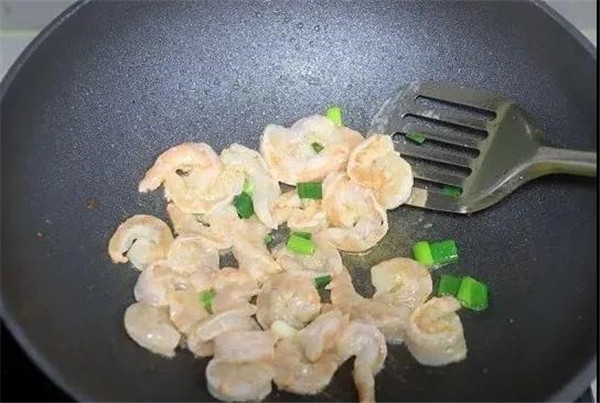 将虾仁和葱花倒锅中轻轻翻炒