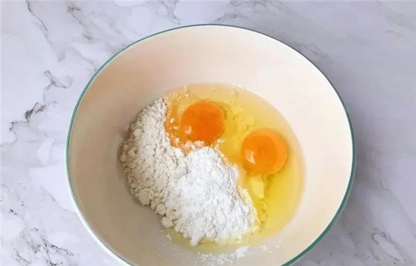 3. 碗中放面粉60克,玉米淀粉60克,鸡蛋3个。