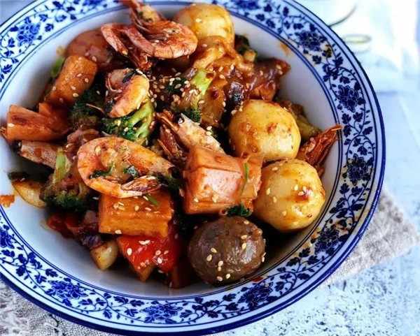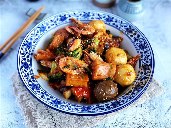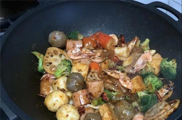 6. 取适量麻辣香锅调料倒入锅中炒香,红红的颜色非常漂亮。