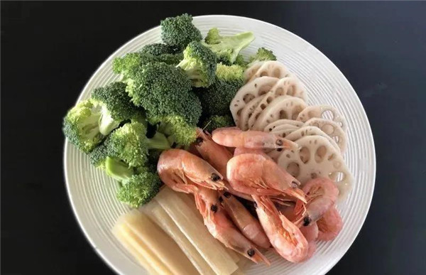 1、首先来准备一下食材,北极甜虾,西兰花,藕片以及各种鱼丸,全部处理干净,切的大小适中(所有食材均可以根据自己的喜好替换)。