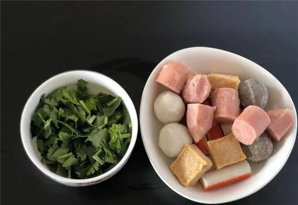 2. 鱼丸类的要提前一会儿拿出来解冻,香菜是麻辣香锅的灵魂,必不可少,洗净切成1厘米长的小段备用。