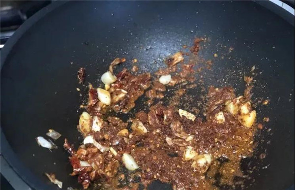 5. 另起锅热油,油量跟平时炒菜量一样即可,放入葱段,蒜片,干辣椒段炒香。