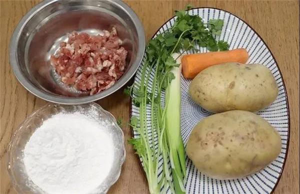 肉馅100克、大土豆2个、胡萝卜半根、香菜1棵、土豆淀粉适量、白胡椒粉适量、盐适量、酱油少许、生抽少许、醋适量、辣椒油适量