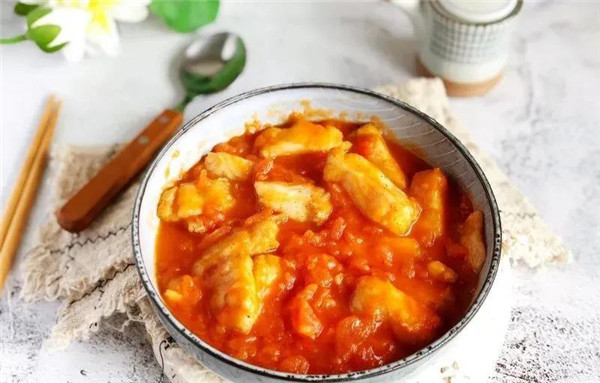 巴沙鱼1条、番茄1个、料酒2勺、黑胡椒粉适量、盐少量、油适量、味极鲜2勺、蚝油1勺、蕃茄酱3勺、清水适量、盐少量