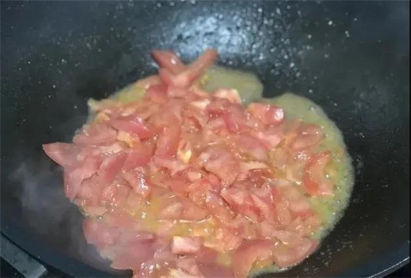 3. 另起锅热油,放入切好的西红柿丁不断翻炒,至基本融化。