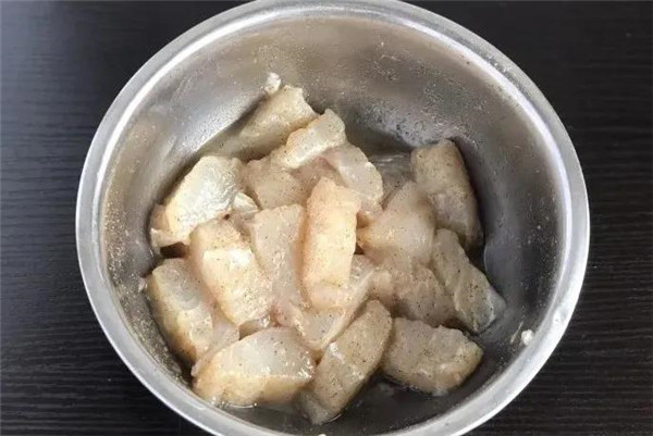 1、将巴沙鱼改刀切成条,加入黑胡椒粉,盐及料酒,抓匀腌制至少1小时。