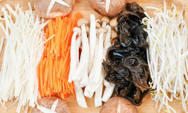 1. 将豆芽、胡萝卜和各类菌菇洗净,香菇改花刀,胡萝卜切丝,起锅烧油,先下入豆芽炒至断生;