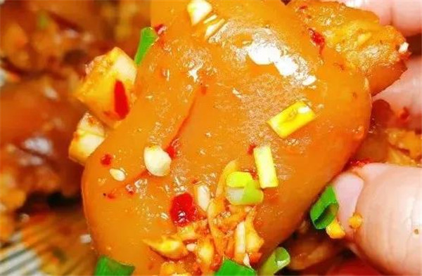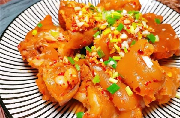 猪蹄1.5、八角4个、桂皮5个、香叶4片、干辣椒适量、孜然一小把、白芷2个、盐2勺、料酒适量、生抽2勺、麻油2勺、蒜适量、辣椒油2勺、葱花适量