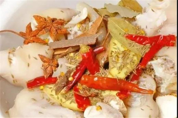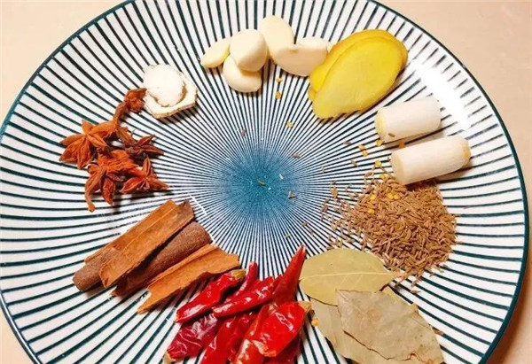 6. 将洗净的猪蹄放入沙锅内,加入我们刚才准备好的香料。