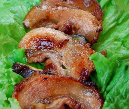 4.将平底锅烧热,把腌好的肉片平摊在锅中小火慢煎。两面都煎至变色后,刷上少许腌料,煎至两黄微微焦黄后撒上熟芝麻即可。