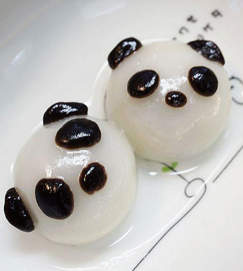 12 贴在做好的汤圆上.可爱的小熊猫汤圆就做好啦!
