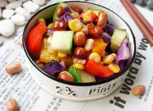 1. 锅内放少许油,然后开小火!花生米凉油入锅,慢慢炸酥,然后捞出晾凉,紫甘蓝切块,黄瓜彩椒均切块