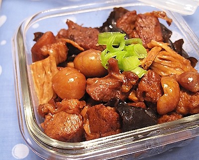 12. 焖制好的羊肉中放入腐竹段和板栗,翻炒均匀。