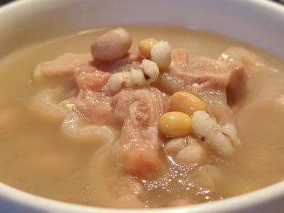 2、将花生用冷水浸泡15分钟。汤锅中放入猪蹄加入冷水没过表面一点左右,用大火将水烧开,撇去表层浮沫