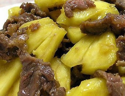 这个菜炒的时间不超过一分半钟,动作一定要快,事先最好一次性将牛肉味道腌足,不然牛肉炒久变老而韧,就不好吃了。菠萝不要煮太久,以免发酸。