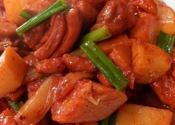 6、锅里加清汤少许及黄酒、白糖、香油、味精,同时将鸡丁、笋丁一起倒入,将锅颠翻几下;