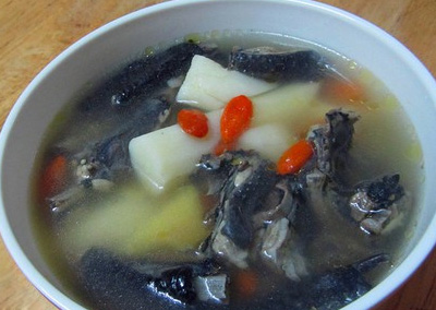 乌骨鸡1只、山药150克、枸杞10克、葱姜、盐、料酒适量。