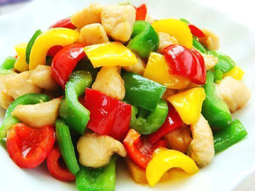 5、倒入青红椒翻炒。倒入鸡丁翻炒,加少许温水焖煮;