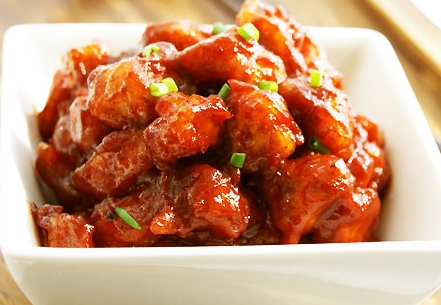 6、倒入炸好的肉丁,炒匀即可。