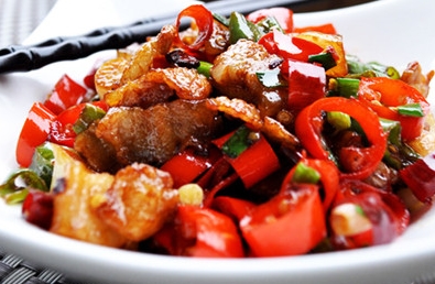 五花肉、红尖椒、尖椒、色拉油、盐、蒜、干辣椒、料酒、生抽、老抽、淀粉、小葱、白糖、高汤。