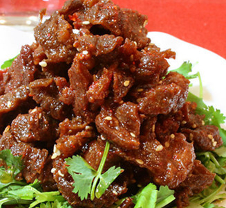 3、锅放火上,加入香油烧至七成热,下入牛肉条炸30秒钟,用漏勺捞出;另用一锅放入牛肉条,五香粉,花椒面,辣椒面,白糖和少许醪糟汁炒匀,加入味精起锅即可。