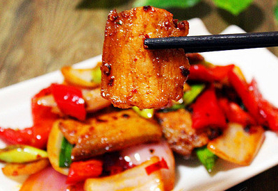 1、五花肉切片、洋葱切块、红辣椒切块、青蒜苗切段、干辣椒切段、蒜切片;