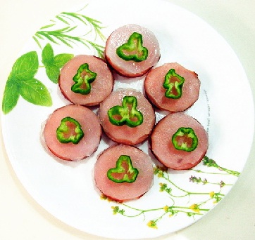 做法:1、将培根切圆薄片备用;