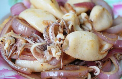 鱿鱼、洋葱、盐、甜辣酱、橄榄油、孜然、绍酒。