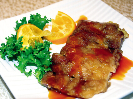 6、取出切块,排放在盘中淋上橙汁酱即可。