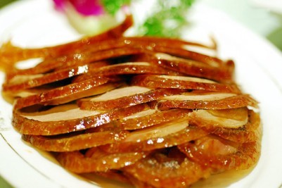 4、锅中倒适量油,加热到7-8分热之后转小火,鸭腿有皮的一面朝下,炸,皮脆焦黄;
