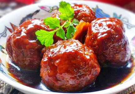 4、炒锅留少许油,放入葱、姜煸香后倒入清水,生抽、老抽、料酒、白糖和炸好的肉丸子,大火烧开后转小火炖煮约30分钟。至汤汁收过半时,用水淀粉勾芡即可。